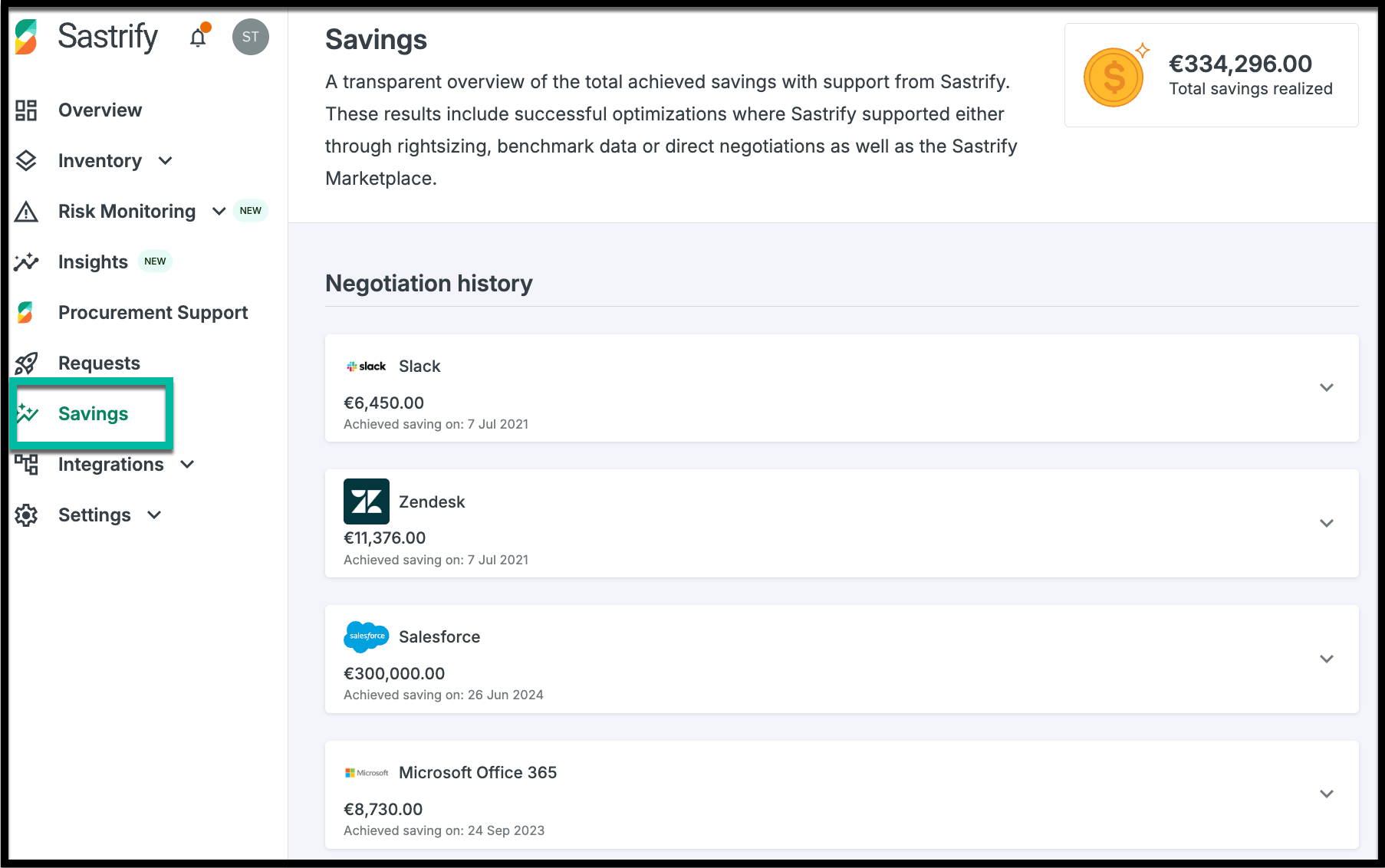 Sastrify has negotiated your contract and secured competitive pricing, resulting in a total annualized achieved savings of €8.3K (~ 15%).