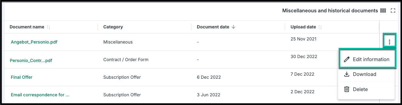To Edit: Click the three-dot icon (⋮) next to any document > Edit Information > Update attributes > Save Changes.