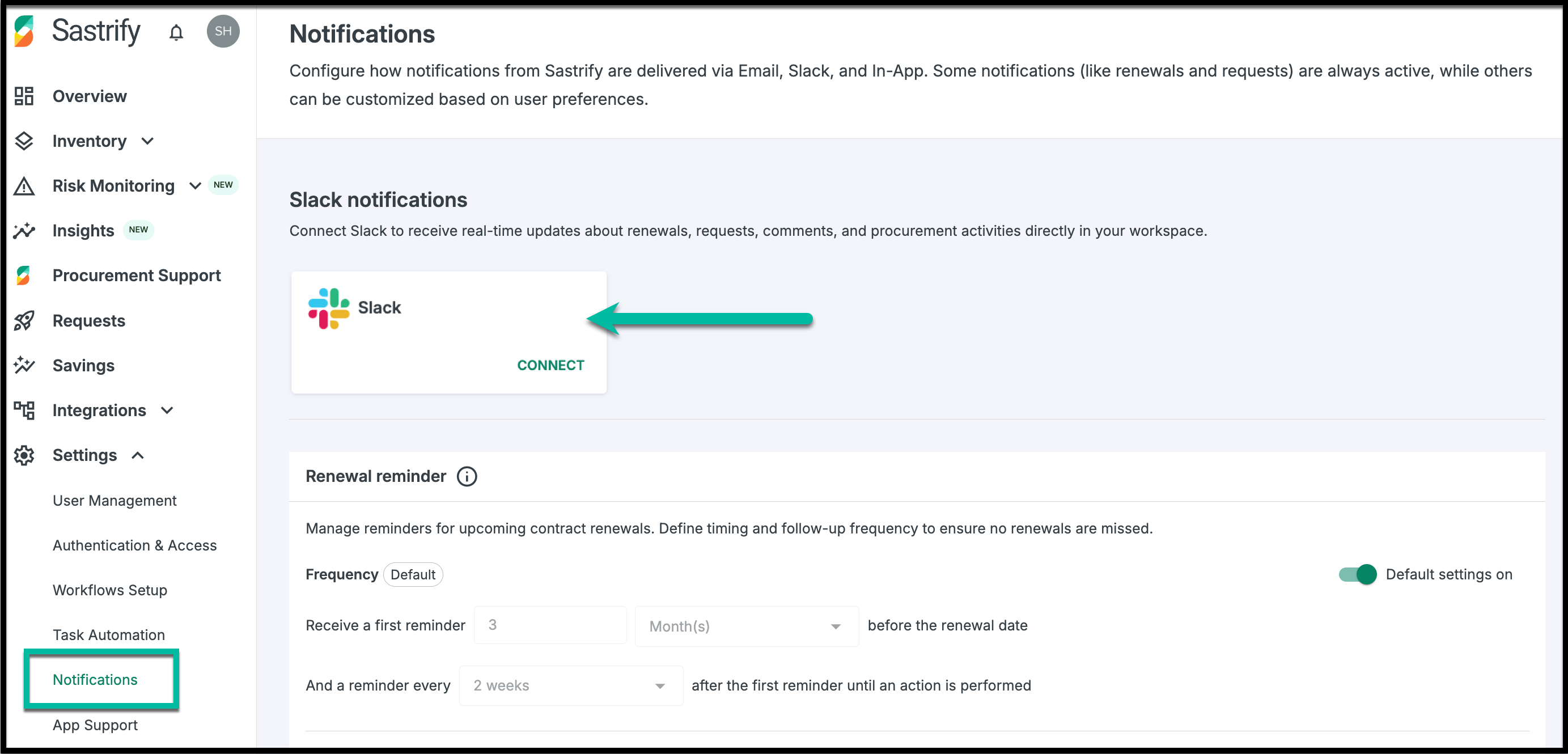 - Locate the Slack Notifications card at the top of the page and click Connect.