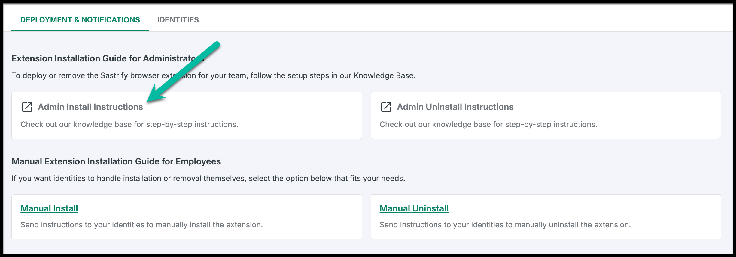 Manual Installation: This decentralized approach requires your Sastrify admin to send installation notifications to selected users. Each notified employee must then manually install the browser extension on their own work browser.