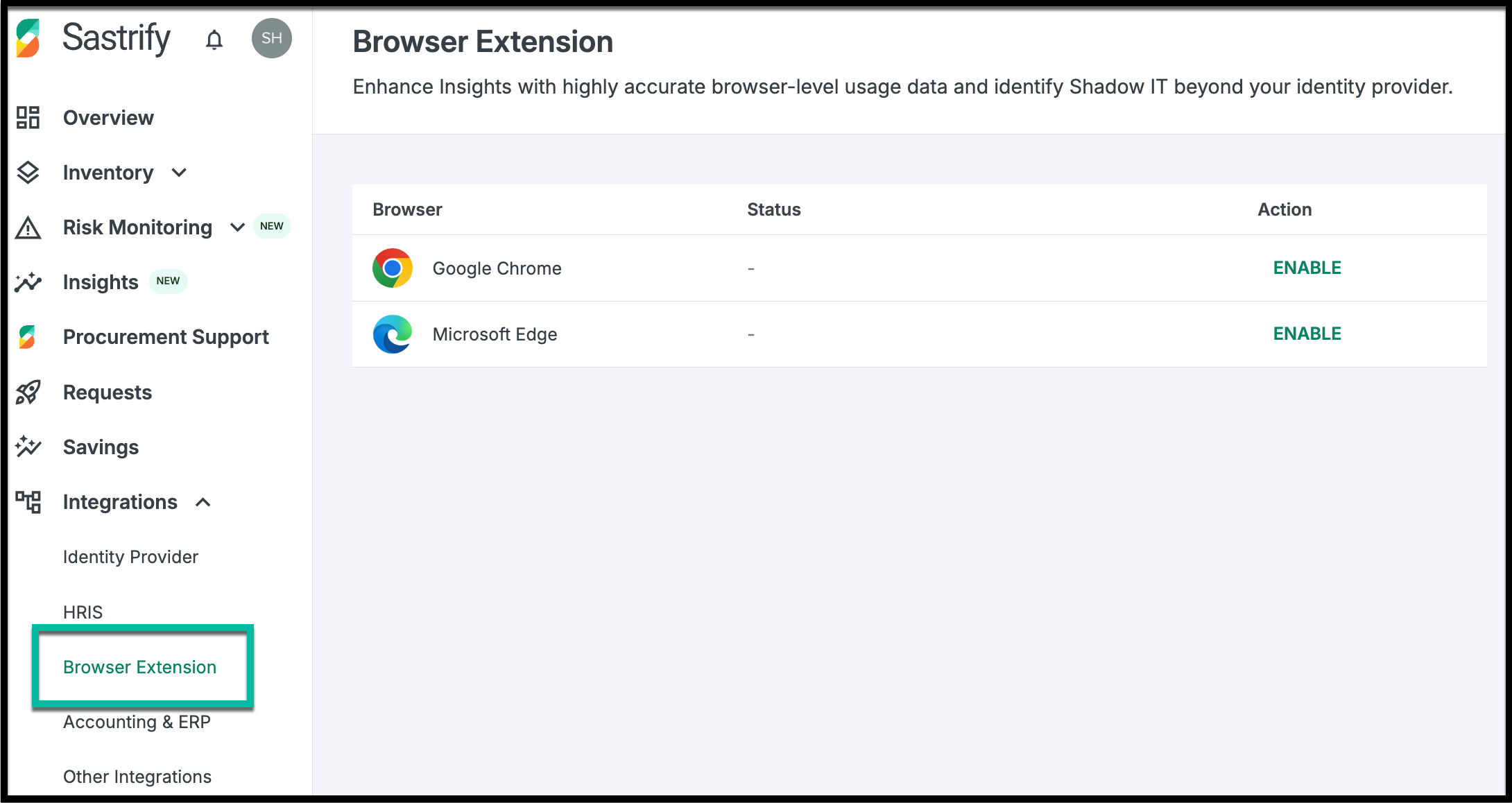 The Sastrify Browser Extension is a lightweight browser add-on designed to enhance visibility into SaaS usage across your organization. It seamlessly supports the discovery of shadow IT and provides actionable usage insights directly within your Sastrify platform.