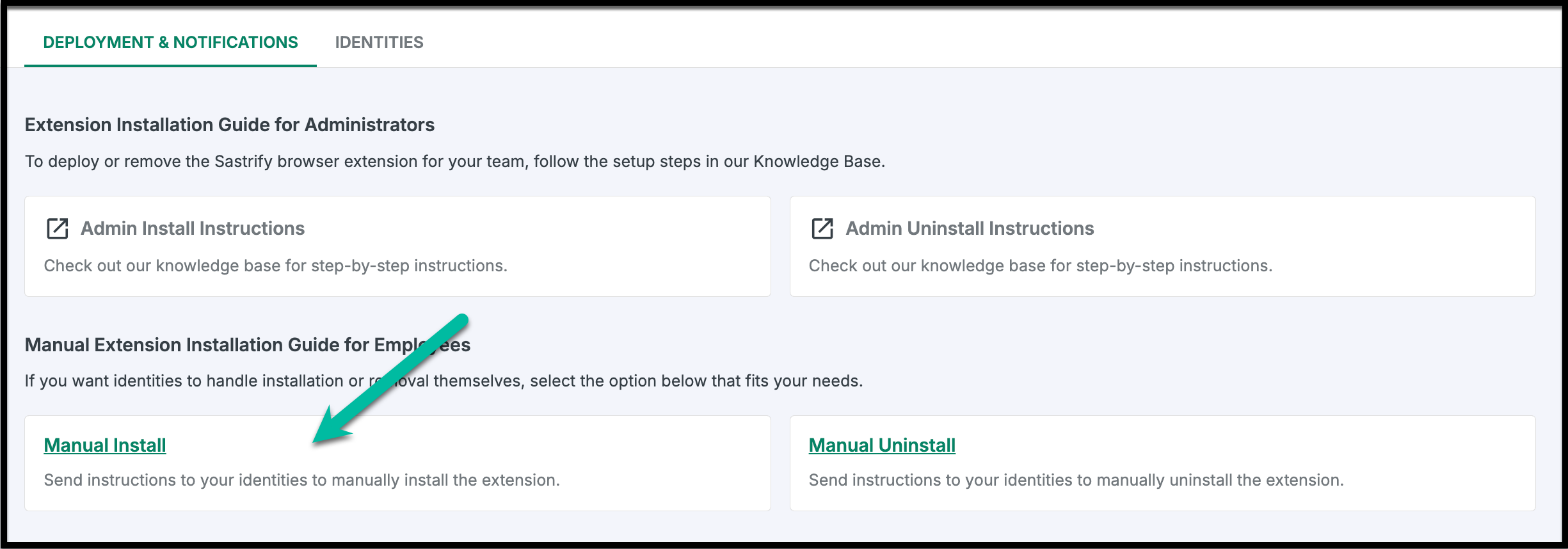 Manual Installation: This decentralized approach requires your Sastrify admin to send installation notifications to selected users. Each notified employee must then manually install the browser extension on their own work browser.