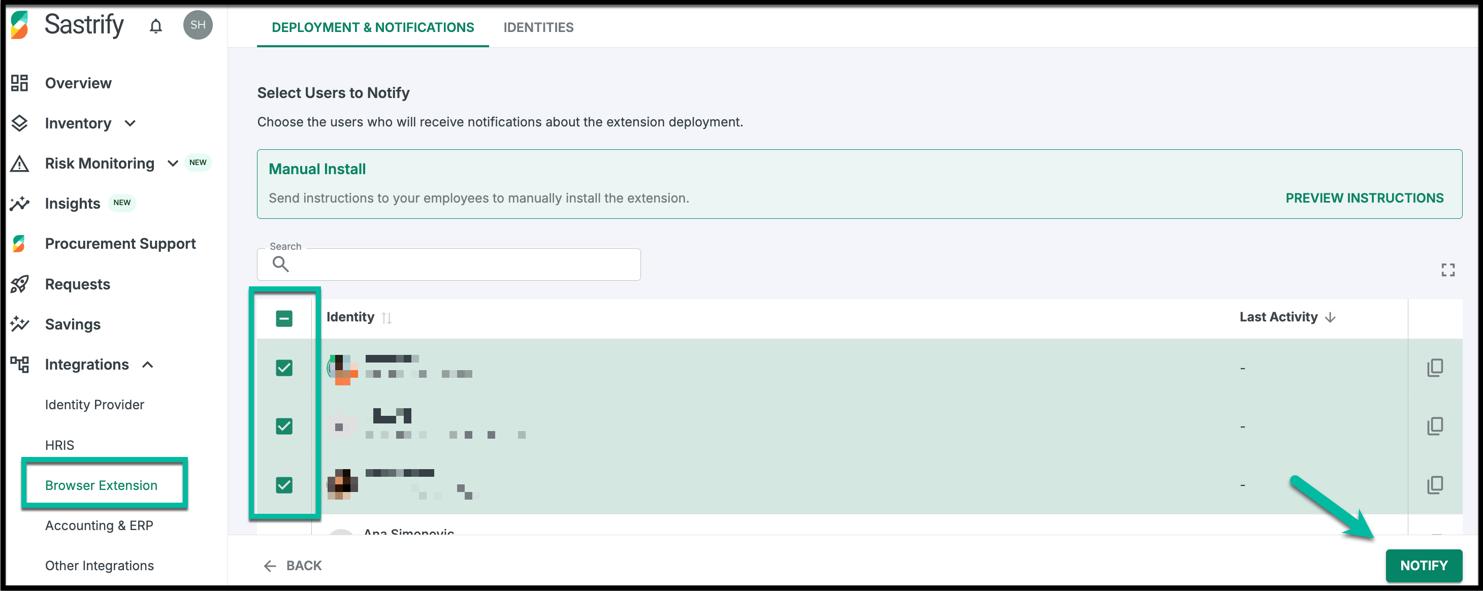 - Check the boxes for the target employees and click Notify. They will receive an automated email with a unique installation link.